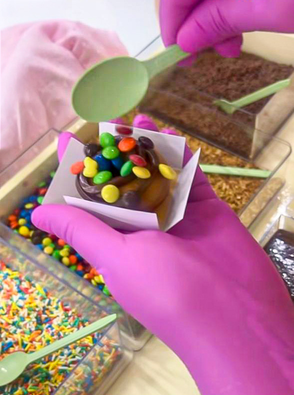 Escolha calda de chocolate, caramelo ou morango