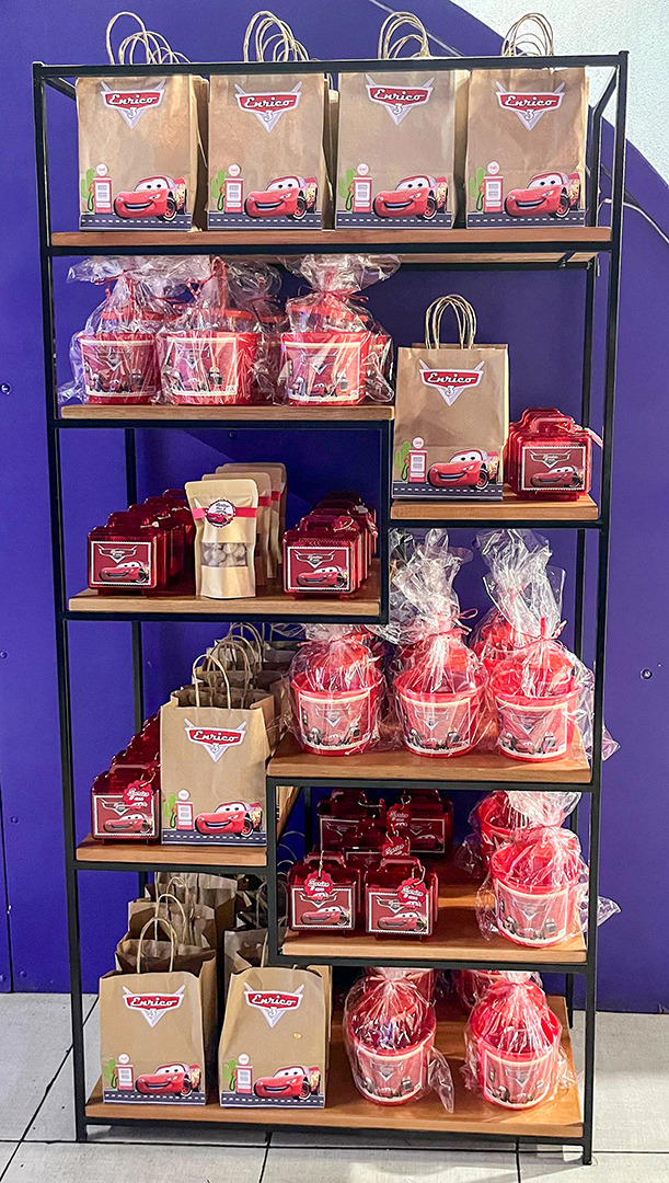 - Os brindes dos convidados são colocados em uma estante fora da decoração.